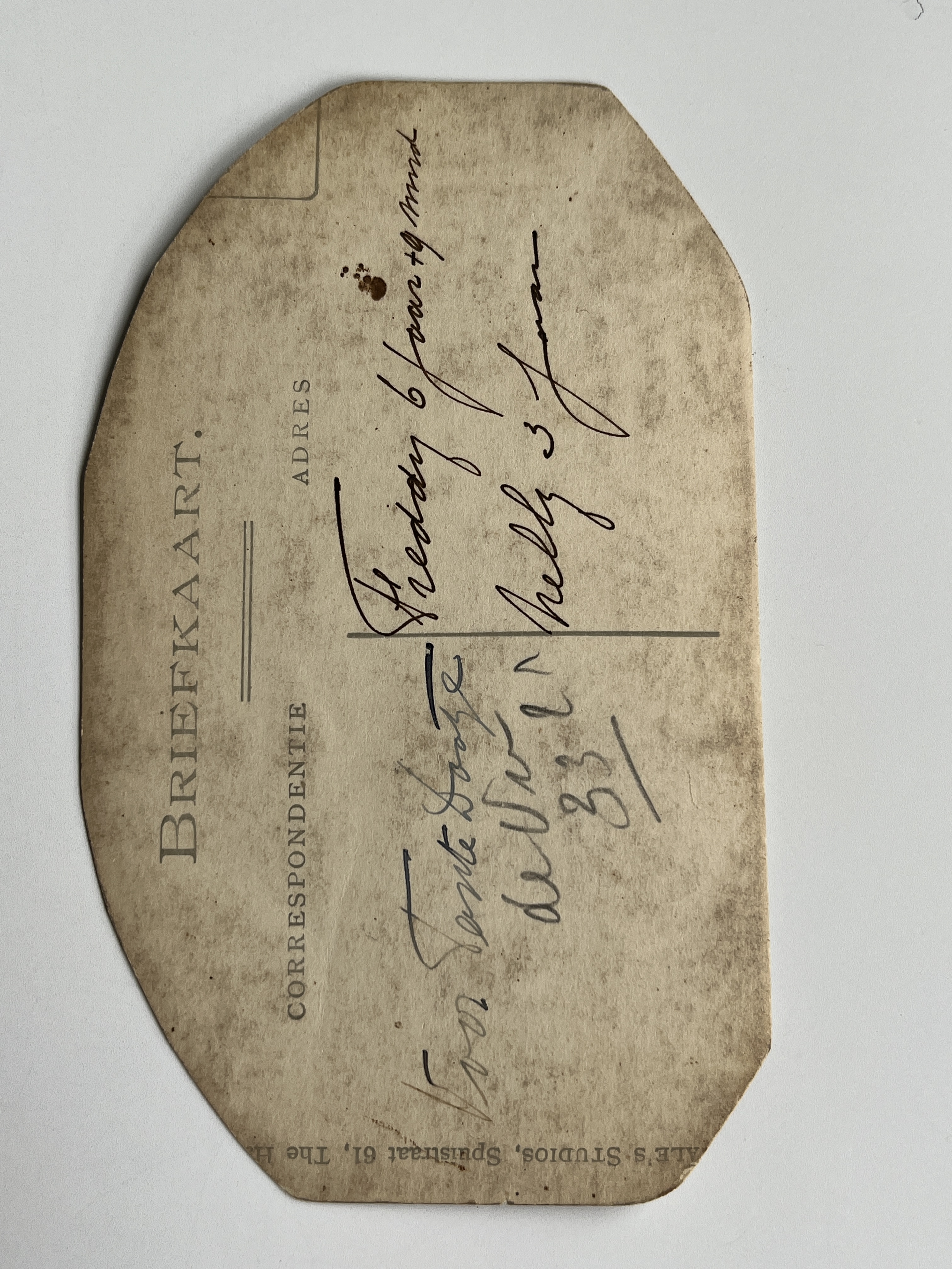This studio portrait is of Fred and his sister Nel. On the reverse is written “voor Tante Daatje”, “Freddy 6 jaar 9 maanden, Nelly 3 jaar”. The photographer is “…ale’s Studios, Spuistraat 61, The H…”. Tante Daatje is Fred’s mother Janna Cunera van Alphen’s younger sister Daatje van Alphen, who married Willem Smit in 1912. It can be dated to April of 1923. Nel turned 3 on April 6, 1923. Perhaps they marked the occasion with a trip to the photo studio, which was at Spuistraat 61 in Den Haag.